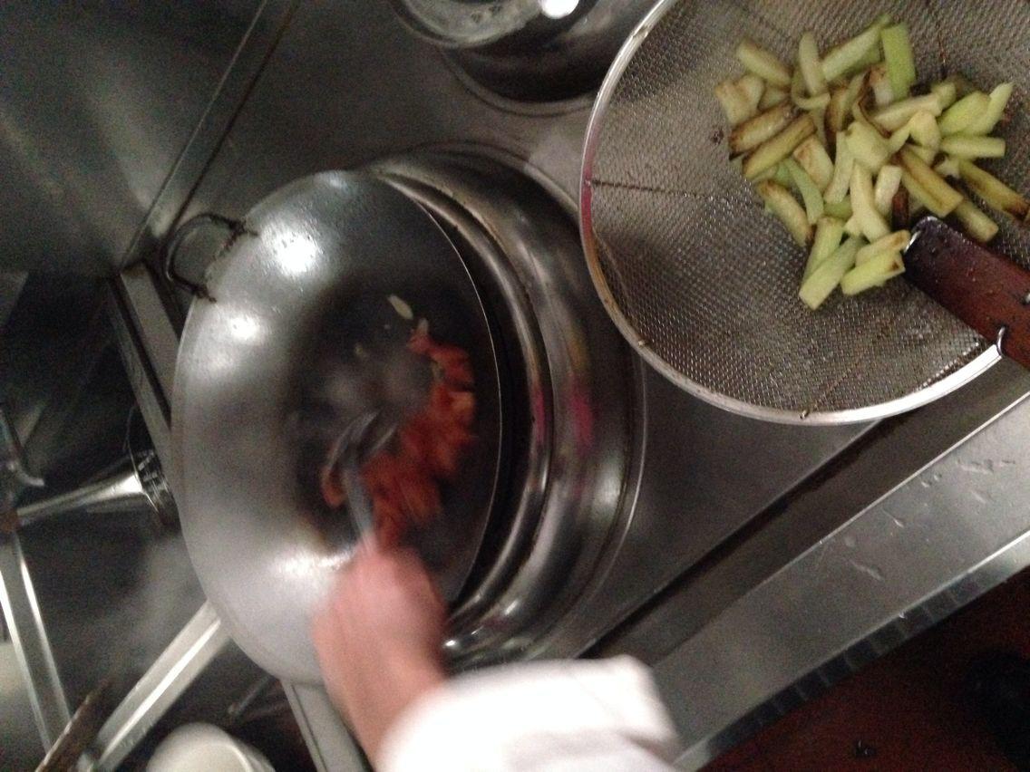 并教會(huì)大家切菜的方法和技巧,他嫻熟的將茄子切成了條狀,西紅柿切成了丁狀。開(kāi)火并將鍋里放油,油熱了以后,把茄條倒進(jìn)鍋里面,然后開(kāi)始翻炒,等茄子有點(diǎn)發(fā)黃并有陣陣香味的時(shí)候盛出來(lái),把油過(guò)濾掉,加水煮至茄子煮熟,出鍋,水過(guò)濾掉。